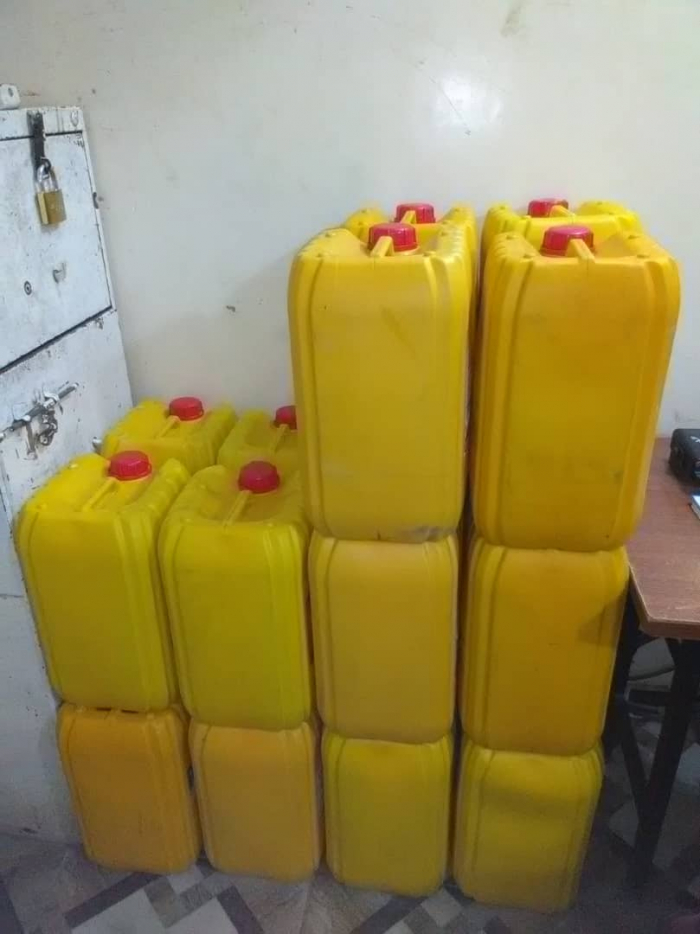 وقبضت القوة الأمنية على المتهم المدعو (م.ط.ع)، بحوزته 20 جالونًا من زيت الطبخ، سعة 20 لترًا في مديرية البريقة، وأحالته للتحقيق.
