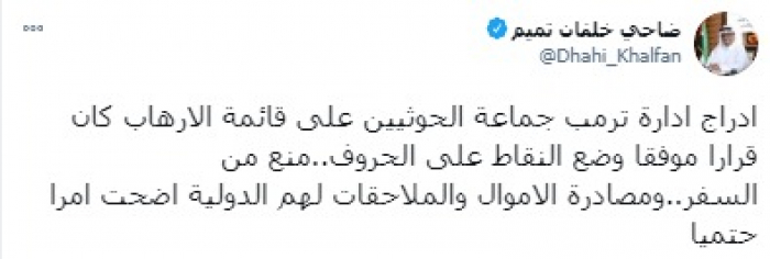 وأشار في تغريدة على حسابه في موقع التدوين المصغر تويتر، اليوم إلى أن: "إدراج إدارة ترامب جماعة الحوثيين على قائمة الإرهاب كان قرارًا موفقًا وضع النقاط على الحروف".