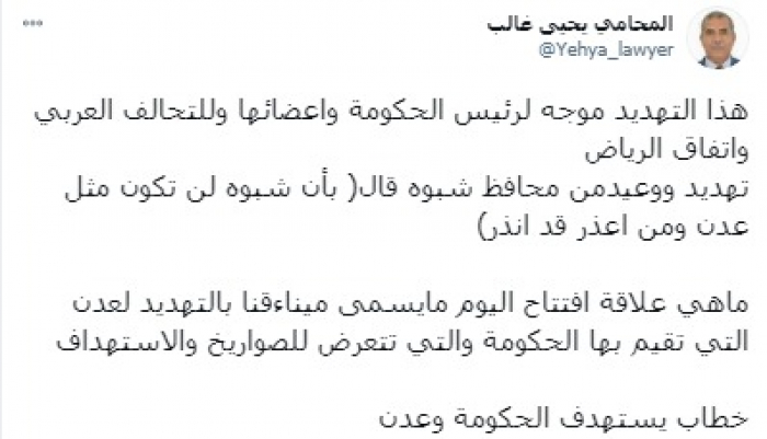 وقال في تغريدة على حسابه بموقع التدوين المصغر تويتر، اليوم إن: "هذا التهديد موجه لرئيس الحكومة وأعضائها وللتحالف العربي واتفاق الرياض".