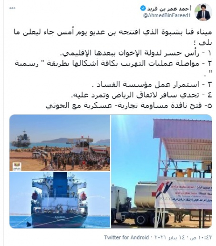 وكتب "بن فريد" تغريدة عبر حسابه بتويتر، رصدها "المشهد العربي": "ميناء قنا بشبوة الذي افتتحه بن عديو يوم أمس جاء ليعلن ما يلي: