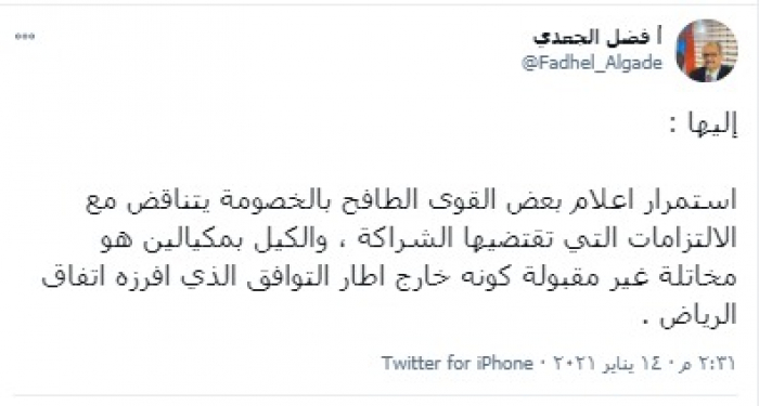 وكتب "الجعدي" تغريدة عبر حسابه بتويتر، رصدها "المشهد العربي": "استمرار إعلام بعض القوى الطافح بالخصومة يتناقض مع الالتزامات التي تقتضيها الشراكة ، والكيل بمكيالين هو مخاتلة غير مقبولة كونه خارج إطار التوافق الذي أفرزه اتفاق الرياض" .