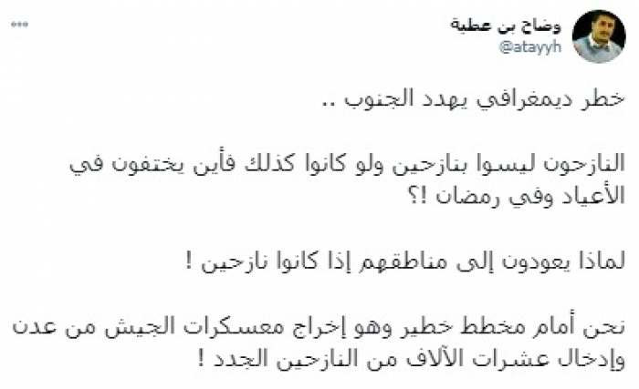 حذر وضاح بن عطية عضو الجمعية الوطنية، من تعرض الجنوب إلى خطر ديمغرافي يهدده، مشددا على أن هناك مخططا لإخراج العسكريين من العاصمة عدن وإدخال آلاف النازحين.
