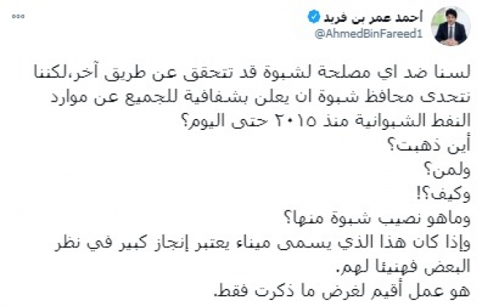 وأكد في تغريدة على حسابه بموقع التدوين المصغر تويتر، اليوم أننا "لسنا ضد أي مصلحة لشبوة قد تتحقق عن طريق آخر، لكننا نتحدى محافظ شبوة أن يعلن بشفافية للجميع عن موارد النفط الشبوانية منذ ٢٠١٥ حتى اليوم".