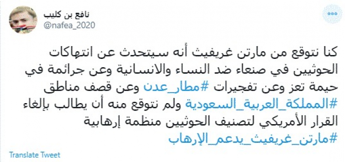 وقال في تغريدة عبر "تويتر" رصدها "المشهد العربي": "كنا نتوقع من مارتن غريفيث أنه سيتحدث عن انتهاكات الحوثيين في صنعاء ضد النساء والإنسانية وعن جرائمه في حيمة تعز وعن تفجيرات مطار عدن وعن قصف مناطق المملكة العربية السعودية ولم نتوقع منه أن يطالب بإلغاء القرار الأمريكي لتصنيف الحوثيين منظمة إرهابية".