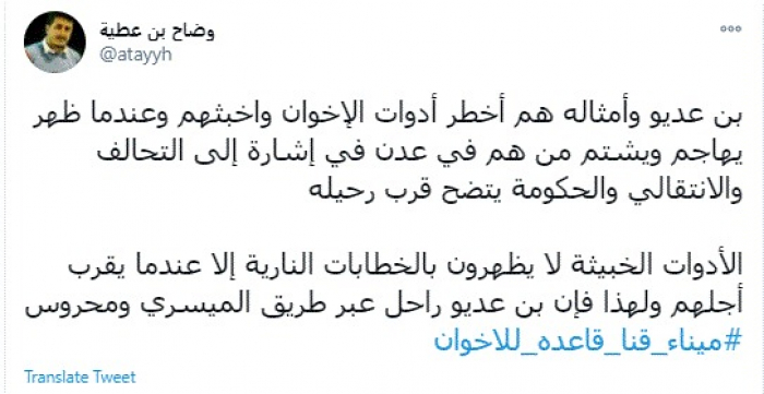 وقال في تغريدة عبر "تويتر" رصدها "المشهد العربي": "بن عديو وأمثاله هم أخطر أدوات الإخوان وأخبثهم وعندما ظهر يهاجم ويشتم من هم في عدن في إشارة إلى التحالف والانتقالي والحكومة يتضح قرب رحيله".
