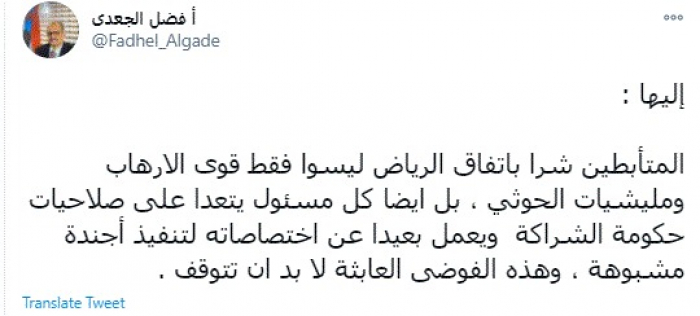 وأضاف: "بل أيضًا كل مسؤول يتعدى على صلاحيات حكومة الشراكة ويعمل بعيدًا عن اختصاصاته لتنفيذ أجندة مشبوهة، وهذه الفوضى العابثة لا بد أن تتوقف".