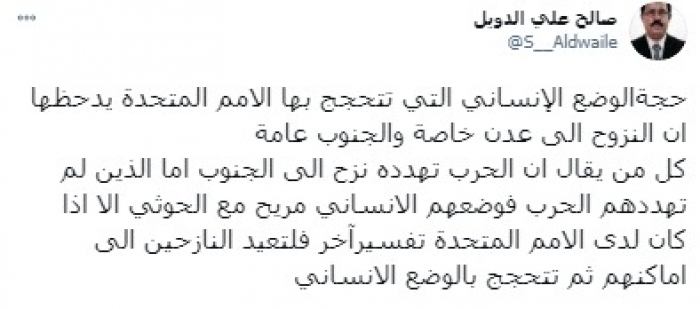 وقال في تغريدة على حسابه بموقع التدوين المصغر تويتر، اليوم إن: "حجة الوضع الإنساني التي تتحجج بها الأمم المتحدة يدحضها أن النزوح إلى عدن خاصة والجنوب عامة".