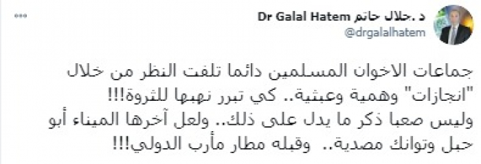 وشدد في تغريدة على حسابه بموقع التدوين المصغر تويتر، اليوم على أن: "جماعات الإخوان المسلمين دائما تلفت النظر من خلال (إنجازات) وهمية وعبثية.. كي تبرر نهبها للثروة!!!".