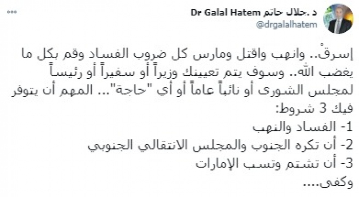 وتابع: "المهم أن يتوفر فيك 3 شروط: 1- الفساد والنهب 2- أن تكره الجنوب والمجلس الانتقالي الجنوبي 3- أن تشتم وتسب الإمارات".