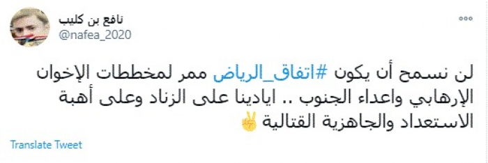 وكتب في تغريدة عبر "تويتر" رصدها "المشهد العربي": "لن نسمح أن يكون اتفاق الرياض ممر لمخططات الإخوان الإرهابي وأعداء الجنوب.. أيادينا على الزناد وعلى أهبة الاستعداد والجاهزية القتالية".