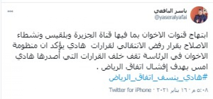 وكتب "اليافعي تغريدة عبر حسابه بتويتر، رصدها "المشهد العربي": "ابتهاج قنوات الإخوان بما فيها قناة الجزيرة وبلقيس ونشطاء الإصلاح بقرار رفض الانتقالي لقرارات هادي، يؤكد أن منظومة الإخوان في الرئاسة تقف خلف القرارات التي أصدرها هادي أمس بهدف إفشال اتفاق الرياض" .