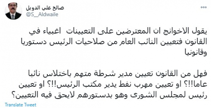 وأضاف: "فهل من القانون تعيين مدير شرطة متهم باختلاس نائبًا عامًا!!؟ أو تعيين مهرب نفط يدير مكتب الرئيس!!؟ أو تعيين رئيس لمجلس الشورى وهو بدستورهم لا يحق فيه التعيين؟".