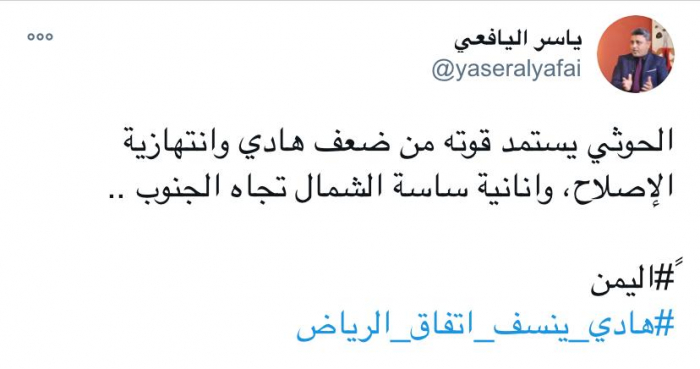 واختتم تغريدته بهاشتاج: "اليمن، هادي ينسف اتفاق الرياض".