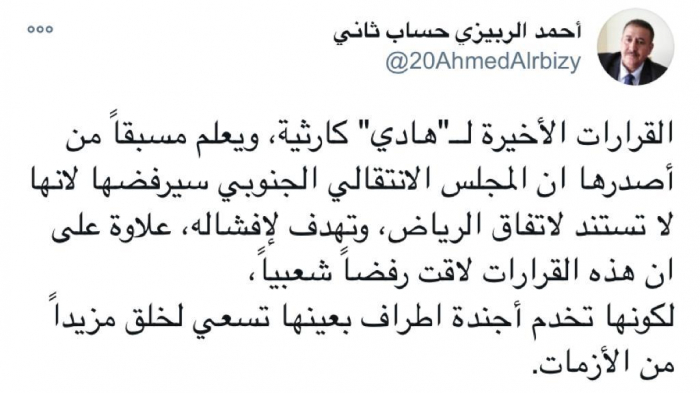 وشدد في تغريدة على حسابه بموقع التدوين المصغر تويتر، اليوم على أن: "القرارات الأخيرة لــ"هادي" كارثية، ويعلم مسبقًا من أصدرها أن المجلس الانتقالي الجنوبي سيرفضها لأنها لا تستند لاتفاق الرياض، وتهدف لإفشاله".