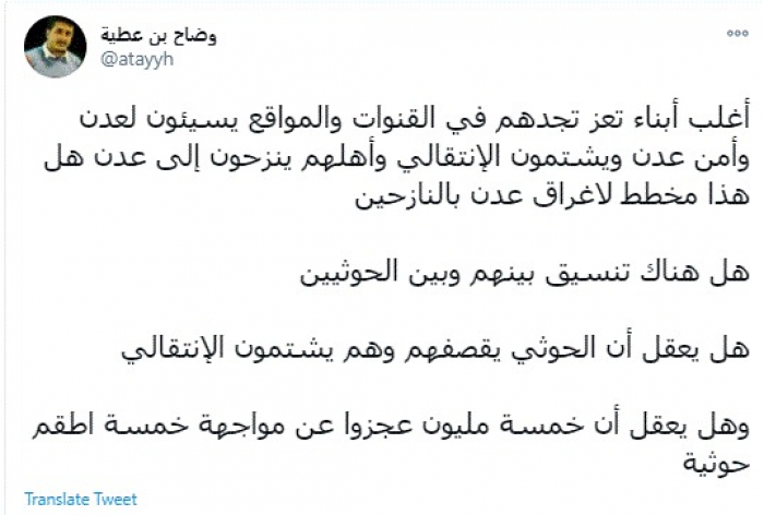 وقال في تغريدة عبر "تويتر" رصدها "المشهد العربي": "أغلب أبناء تعز تجدهم في القنوات والمواقع يسيئون لعدن وأمن عدن ويشتمون الانتقالي وأهلهم ينزحون إلى عدن هل هذا مخطط لإغراق عدن بالنازحين".