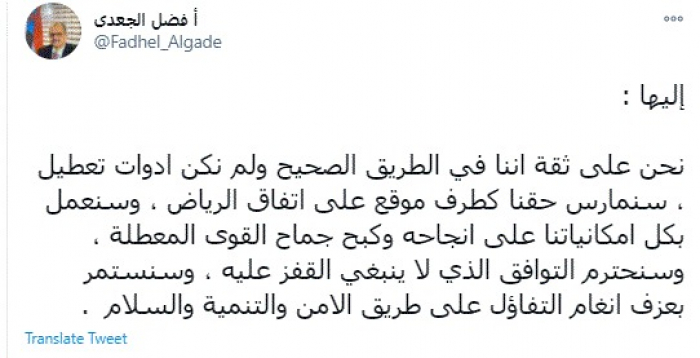 وكتب في تغريدة عبر "تويتر" رصدها "المشهد العربي": "نحن على ثقة أننا في الطريق الصحيح ولم نكن أدوات تعطيل، سنمارس حقنا كطرف موقع على اتفاق الرياض، وسنعمل بكل إمكانياتنا على إنجاحه وكبح جماح القوى المعطلة".