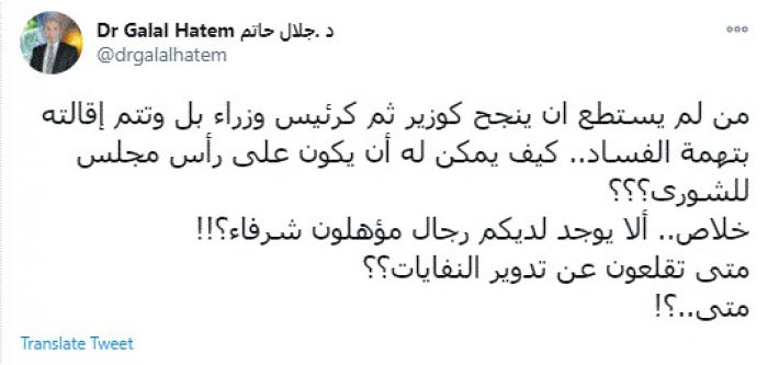وقال في تغريدة عبر "تويتر" رصدها "المشهد العربي": "من لم يستطع أن ينجح كوزير ثم كرئيس وزراء بل وتتم إقالته بتهمة الفساد.. كيف يمكن له أن يكون على رأس مجلس للشورى؟".