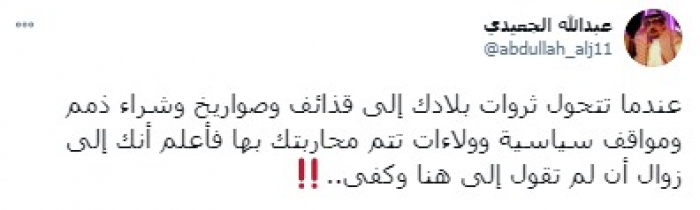وأكد في تغريدة على حسابه بموقع التدوين المصغر تويتر، اليوم أنه: "عندما تتحول ثروات بلادك إلى قذائف وصواريخ وشراء ذمم ومواقف سياسية وولاءات تتم محاربتك بها فاعلم أنك إلى زوال إن لم تقل إلى هنا وكفى".