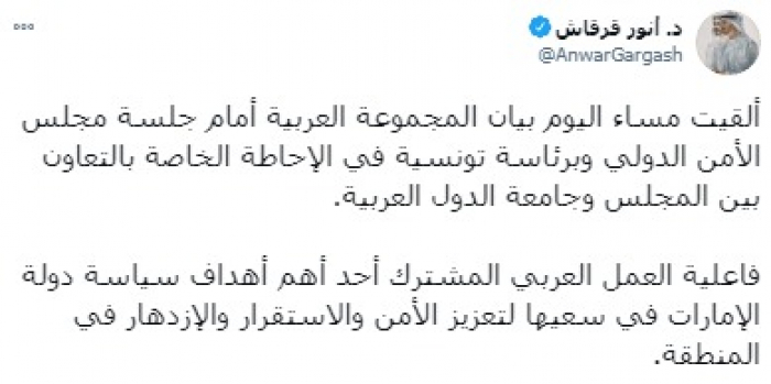 وقال في تغريدة على حسابه بموقع التدوين المصغر تويتر، اليوم الاثنين: "ألقيت مساء اليوم بيان المجموعة العربية أمام جلسة مجلس الأمن الدولي وبرئاسة تونسية في الإحاطة الخاصة بالتعاون بين المجلس وجامعة الدول العربية".