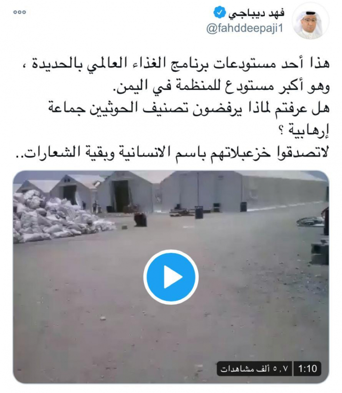 وقال في تغريدة عبر "تويتر" رصدها "المشهد العربي": "هذا أحد مستودعات برنامج الغذاء العالمي بالحديدة ، وهو أكبر مستودع للمنظمة في اليمن".