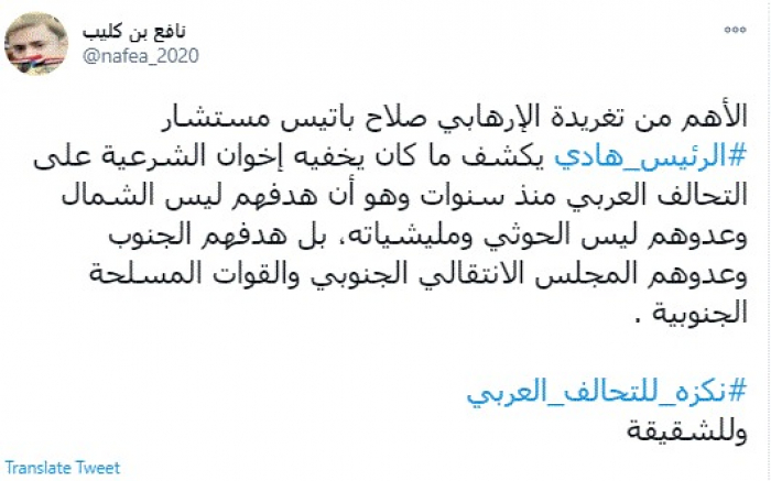 وقال في تغريدة عبر "تويتر" رصدها "المشهد العربي": "الأهم من تغريدة الإرهابي صلاح باتيس مستشار الرئيس هادي يكشف ما كان يخفيه إخوان الشرعية على التحالف العربي منذ سنوات وهو أن هدفهم ليس الشمال وعدوهم ليس الحوثي ومليشياته، بل هدفهم الجنوب وعدوهم المجلس الانتقالي الجنوبي والقوات المسلحة الجنوبية".