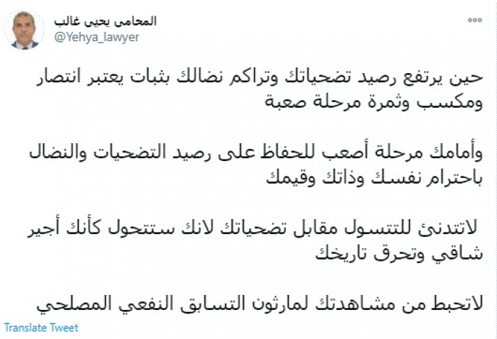وقال في تغريدة عبر "تويتر" رصدها "المشهد العربي": "حين يرتفع رصيد تضحياتك وتراكم نضالك بثبات يعتبر انتصار ومكسب وثمرة مرحلة صعبة وأمامك مرحلة أصعب للحفاظ على رصيد التضحيات والنضال باحترام نفسك وذاتك وقيمك".