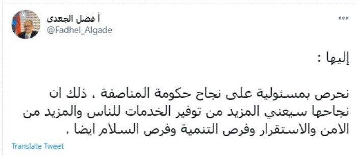 وكتب في تغريدة عبر "تويتر" رصدها "المشهد العربي": "نحرص بمسؤولية على نجاح حكومة المناصفة، ذلك أن نجاحها سيعني المزيد من توفير الخدمات للناس والمزيد من الأمن والاستقرار وفرص التنمية وفرص السلام أيضًا".