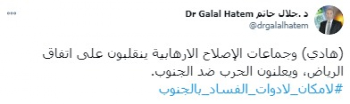 وقال في تغريدة على حسابه بموقع التدوين المصغر تويتر، اليوم إن: "(هادي) وجماعات الإصلاح الإرهابية ينقلبون على اتفاق الرياض، ويعلنون الحرب ضد الجنوب".