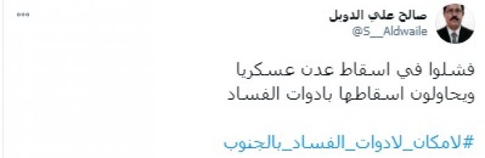 وقال في تغريدة على حسابه بموقع التدوين المصغر تويتر، اليوم: "فشلوا في إسقاط عدن عسكريًا ويحاولون إسقاطها بأدوات الفساد"، مختتما: "لا مكان لأدوات الفساد بالجنوب".