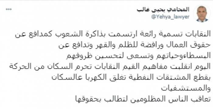 وشدد في تغريدة على حسابه بموقع التدوين المصغر تويتر، اليوم على أن: "النقابات تسمية رائعة ارتسمت بذاكرة الشعوب كمدافع عن حقوق العمال ورافضة للظلم والقهر وتدافع عن البسطاء وحياتهم وتسعى لتحسين ظروفهم".