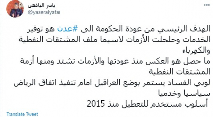 وكتب في تغريدة عبر "تويتر" رصدها "المشهد العربي": "الهدف الرئيسي من عودة الحكومة إلى عدن هو توفير الخدمات وحلحلت الأزمات لا سيما ملف المشتقات النفطية والكهرباء".