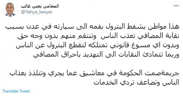 وقال في تغريدة عبر "تويتر" رصدها "المشهد العربي": "هذا مواطن يشفط البترول بفمه إلى سيارته في عدن بسبب نقابة المصافي تعذب الناس وتنتقم منهم بدون وجه حق وبدون أي مسوغ قانوني تمتلكه لتقطع البترول عن الناس وربما تتمادى النقابات إلى التهديد بإحراق المصافي".