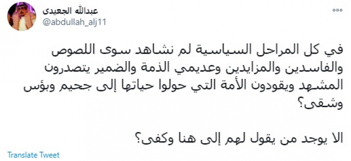 وكتب في تغريدة عبر "تويتر" رصدها "المشهد العربي": "في كل المراحل السياسية لم نشاهد سوى اللصوص والفاسدين والمزايدين وعديمي الذمة والضمير يتصدرون المشهد ويقودون الأمة التي حولوا حياتها إلى جحيم وبؤس وشقى؟ ألا يوجد من يقول لهم إلى هنا وكفى؟".