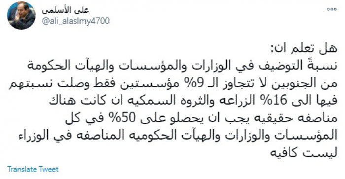 وكتب في تغريدة عبر "تويتر" رصدها "المشهد العربي": "هل تعلم أن: نسبةً التوظيف في الوزارات والمؤسسات والهيئات الحكومية من الجنوبين لا تتجاوز الـ 9%".