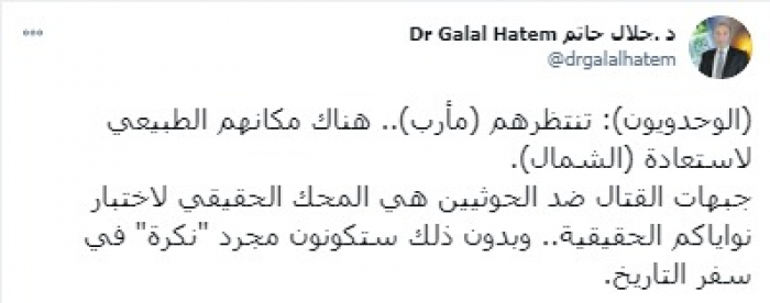 وشدد في تغريدة على حسابه بموقع التدوين المصغر تويتر، اليوم على أن: "(الوحدويون): تنتظرهم (مأرب).. هناك مكانهم الطبيعي لاستعادة (الشمال)".
