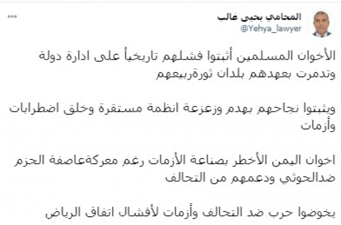 وأكد أنهم: "يثبتون نجاحهم بهدم وزعزعة أنظمة مستقرة وخلق اضطرابات وأزمات"، لافتا إلى أن: "إخوان اليمن الأخطر بصناعة الأزمات رغم معركة عاصفة الحزم ضد الحوثي، ودعمهم من التحالف".
