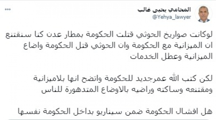 وأوضح في تغريدة على حسابه بموقع التدوين المصغر تويتر، اليوم أنه: "لو كانت صواريخ الحوثي قتلت الحكومة بمطار عدن كنا سنقتنع أن الميزانية مع الحكومة وأن الحوثي قتل الحكومة وأضاع الميزانية وعطل الخدمات".