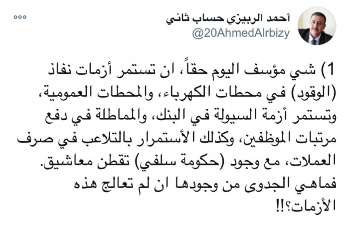 وعبر "الربيزي" عن امتعاضه من أداء الحكومة في سلسلة تغريدات رصدها "المشهد العربي": "شيء مؤسف اليوم حقًا، أن تستمر أزمات نفاذ (الوقود) في محطات الكهرباء، والمحطات العمومية، وتستمر أزمة السيولة في البنك، والمماطلة في دفع مرتبات الموظفين، وكذلك الاستمرار بالتلاعب في صرف العملات، مع وجود (حكومة سلفي) تقطن معاشيق".