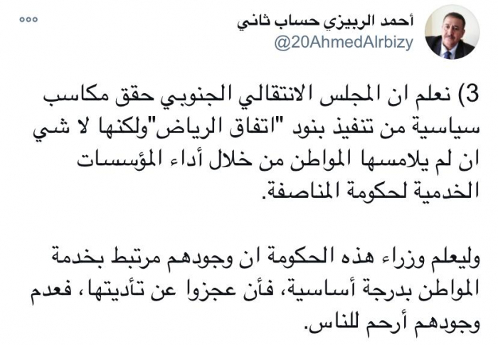وأوضح: " نعلم أن المجلس الانتقالي الجنوبي حقق مكاسب سياسية من تنفيذ بنود "اتفاق الرياض"ولكنها لا شيء إن لم يلامسها المواطن من خلال أداء المؤسسات الخدمية لحكومة المناصفة".