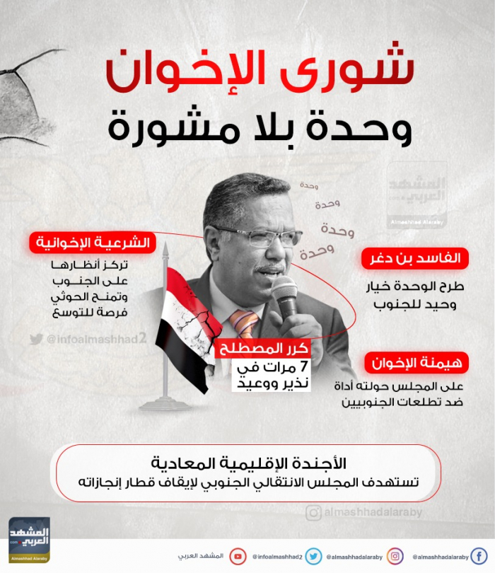 طرح الفاسد المدعو أحمد بن دغر، المُعين رئيسًا لمجلس الشورى الإخواني، الوحدة كخيار وحيد أمام الجنوبيين، في استخفاف بتضحيات شعب الجنوب ودماء الشهداء.