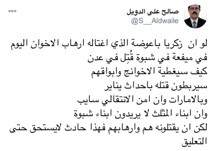 وكتب "الدويل" تغريدة عبر حسابه بتويتر، رصدها "المشهد العربي": "لو أن زكريا باعوضة الذي اغتاله إرهاب الإخوان اليوم في ميفعة في شبوة قُتِل في عدن، كيف سيغطيه الإخوانج وأبواقهم؟".