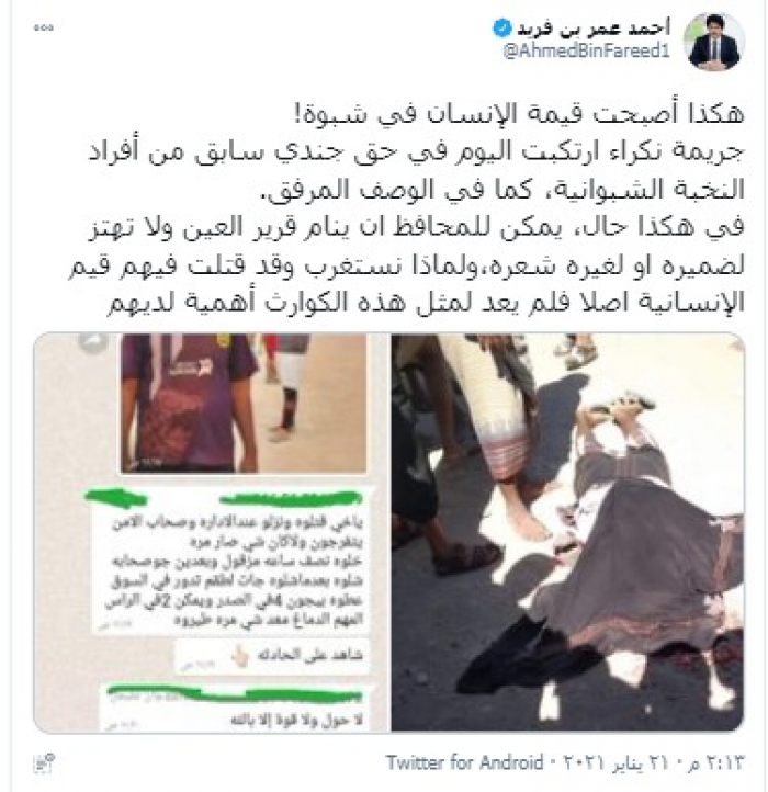 وكتب "بن فريد" تغريدة عبر حسابه بتويتر، رصدها "المشهد العربي": "هكذا أصبحت قيمة الإنسان في شبوة، جريمة نكراء ارتكبت اليوم في حق جندي سابق من أفراد النخبة الشبوانية، كما في الوصف المرفق".