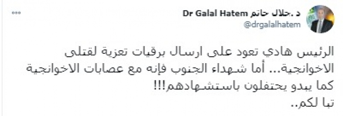 وقال في تغريدة على حسابه بموقع التدوين المصغر تويتر، اليوم إن: "الرئيس هادي تعود على إرسال برقيات تعزية لقتلى الإخوانجية".