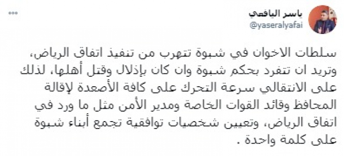 وأضاف: "لذلك على الانتقالي سرعة التحرك على كافة الأصعدة لإقالة المحافظ وقائد القوات الخاصة ومدير الأمن مثل ما ورد في اتفاق الرياض، وتعيين شخصيات توافقية تجمع أبناء شبوة على كلمة واحدة".