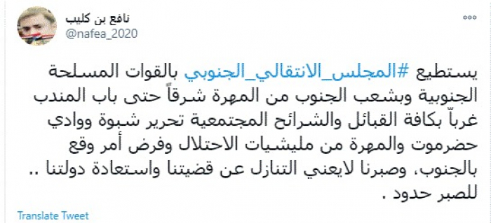 وكتب في تغريدة عبر "تويتر" رصدها "المشهد العربي": "يستطيع المجلس الانتقالي الجنوبي بالقوات المسلحة الجنوبية وبشعب الجنوب من المهرة شرقًا حتى باب المندب غربًا بكافة القبائل والشرائح المجتمعية تحرير شبوة ووادي حضرموت والمهرة من مليشيات الاحتلال وفرض أمر وقع بالجنوب".