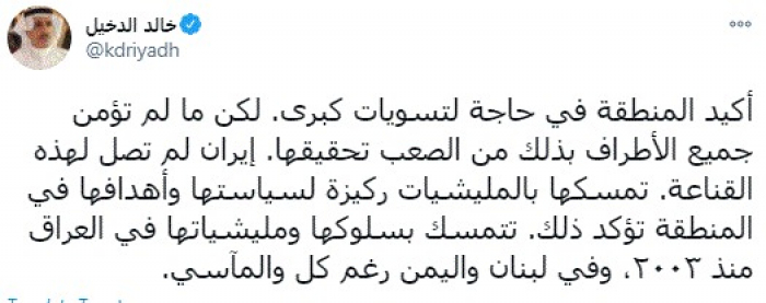 وكتب في تغريدة عبر "تويتر" رصدها "المشهد العربي": "أكيد المنطقة في حاجة لتسويات كبرى. لكن ما لم تؤمن جميع الأطراف بذلك من الصعب تحقيقها. إيران لم تصل لهذه القناعة".
