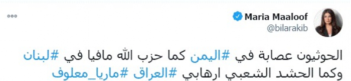 هاجمت الإعلامية اللبنانية ماريا معلوف، اليوم، المليشيات الموالية لإيران في اليمن ولبنان والعراق.