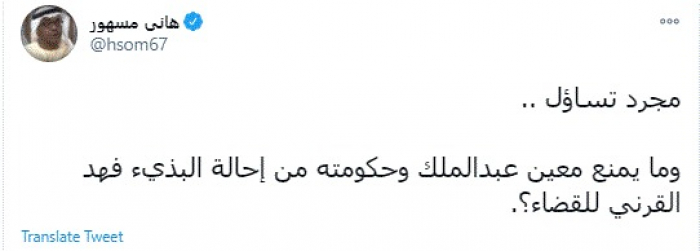 وقال في تغريدة عبر "تويتر" رصدها "المشهد العربي": "مجرد تساؤل.. وما يمنع معين عبدالملك وحكومته من إحالة البذيء فهد القرني للقضاء؟".