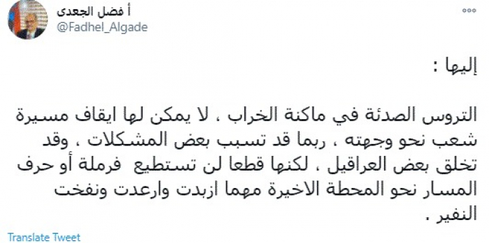 وكتب في تغريدة عبر "تويتر" رصدها "المشهد العربي": "التروس الصدئة في ماكنة الخراب، لا يمكن لها إيقاف مسيرة شعب نحو وجهته، ربما قد تسبب بعض المشكلات، وقد تخلق بعض العراقيل، لكنها قطعًا لن تستطيع فرملة أو حرف المسار نحو المحطة الأخيرة مهما ازبدت وارعدت ونفخت النفير".