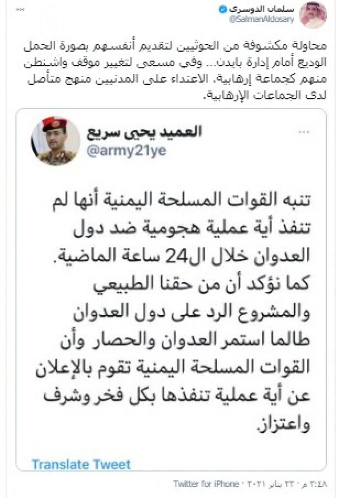 وكتب "الدوسري" تغريدة عبر تويتر، رصدها "المشهد العربي": "محاولة مكشوفة من الحوثيين لتقديم أنفسهم بصورة الحمل الوديع أمام إدارة بايدن… وفي مسعى لتغيير موقف واشنطن منهم كجماعة إرهابية".
